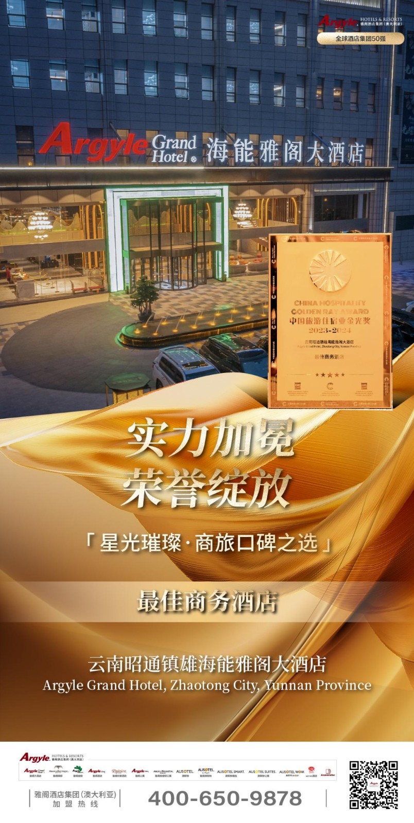 品质为王,荣誉时刻,云南昭通镇雄海能雅阁大酒店(雅阁酒店集团旗下成员酒店)荣获