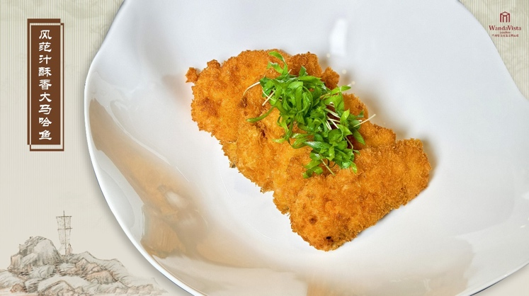 风范汁酥香大马哈鱼,鱼包裹着面衣,不仅能锁住鱼的水分,还能与外皮上的风范汁相结合,中西口味相结合,口味十分丰富。