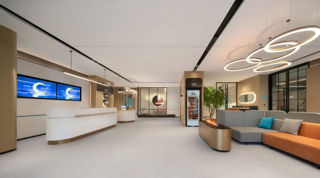 首先,六维睡眠文化围绕“睡眠”构建创新产品,不仅覆盖了客房空间,也将大堂、门头等多个空间囊括其中。比如在“场”的维度,城市便捷酒店在大堂中设计中巧妙地运用了“圆弧”设计,构成了开放与私密的多种场景,满足旅客休息和工作的需求。