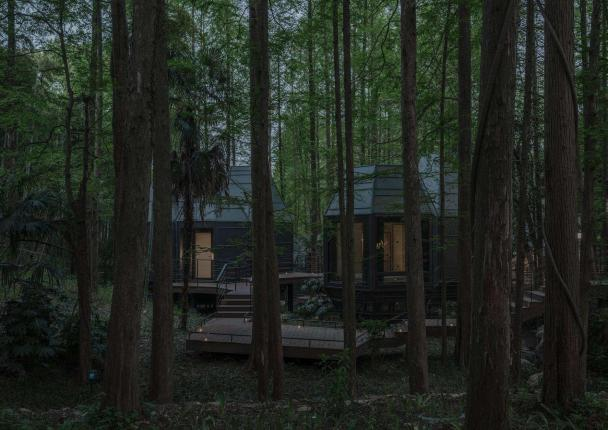 东明山·森语木屋犹如“自然生长”般坐落于森林公园内
