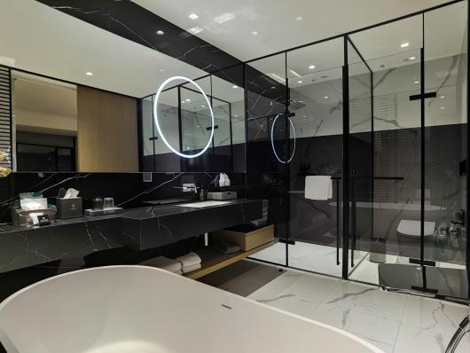 135间客房搭配开放自由的洗漱台、雅致化妆镜;Basinub巴斯诺茶树植萃精华香氛洗护用品。在黄龙祈悦,放松身心,悦见自我。