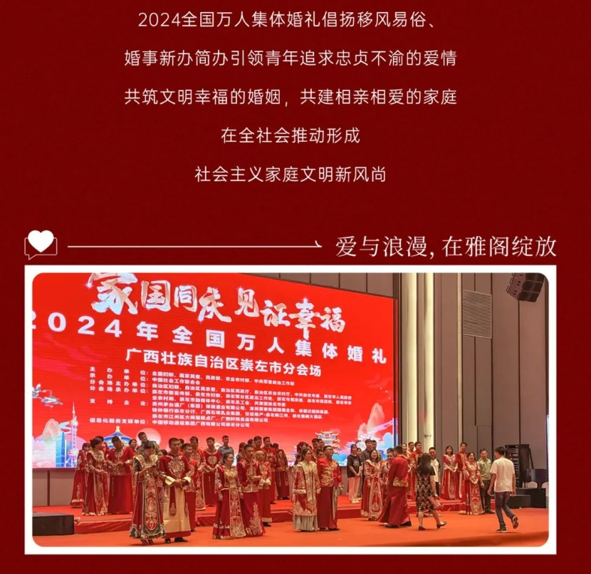全国万人婚礼,珍爱一生,广西崇左雅阁大酒店(雅阁酒店集团旗下成员酒店)与您共同见证。