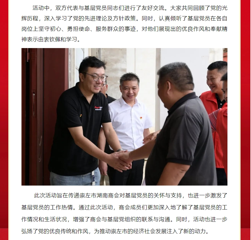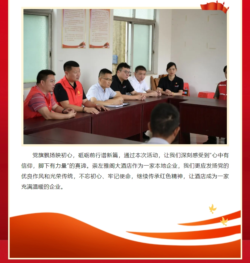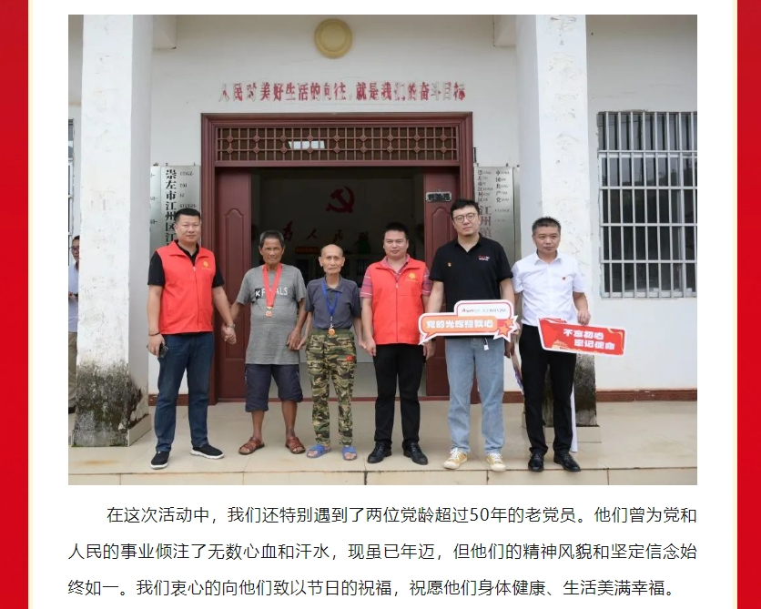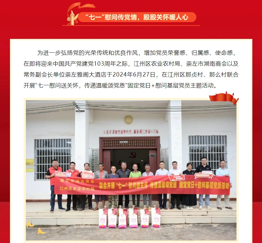为进一步弘扬党的光荣传统和优良作风,增加党员荣誉感、归属感、使命感,在即将迎来中国共产党建党103周年之际,江州区农业农村局、崇左市湖南商会以及常务副会长单位广西崇左雅阁大酒店(雅阁酒店集团旗下成员酒店)于2024年6月27日,在江州区那贞村、那么村联合开展“七一慰问送关怀,传递温暖颂党恩”固定党日+慰问基层党员主题活动。