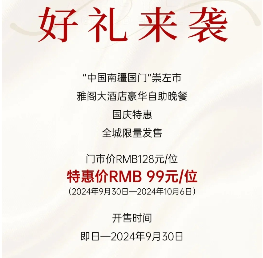 雅阁酒店集团|广西崇左雅阁大酒店,豪华自助晚餐·国庆特惠
