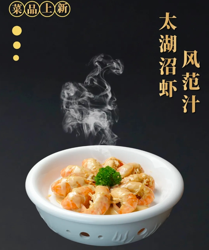 风范汁太湖沼虾的每一只虾都裹着浓郁的风范酱汁,色泽诱人。轻轻剥开虾壳,鲜嫩的虾肉展露无遗,入口先是酱汁的醇厚风味,接着是沼虾本身的鲜甜回甘,虾肉的弹牙口感与丰富的滋味相互交融,带来层次分明的味觉享受。