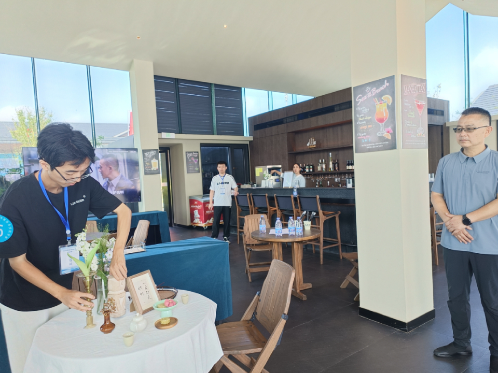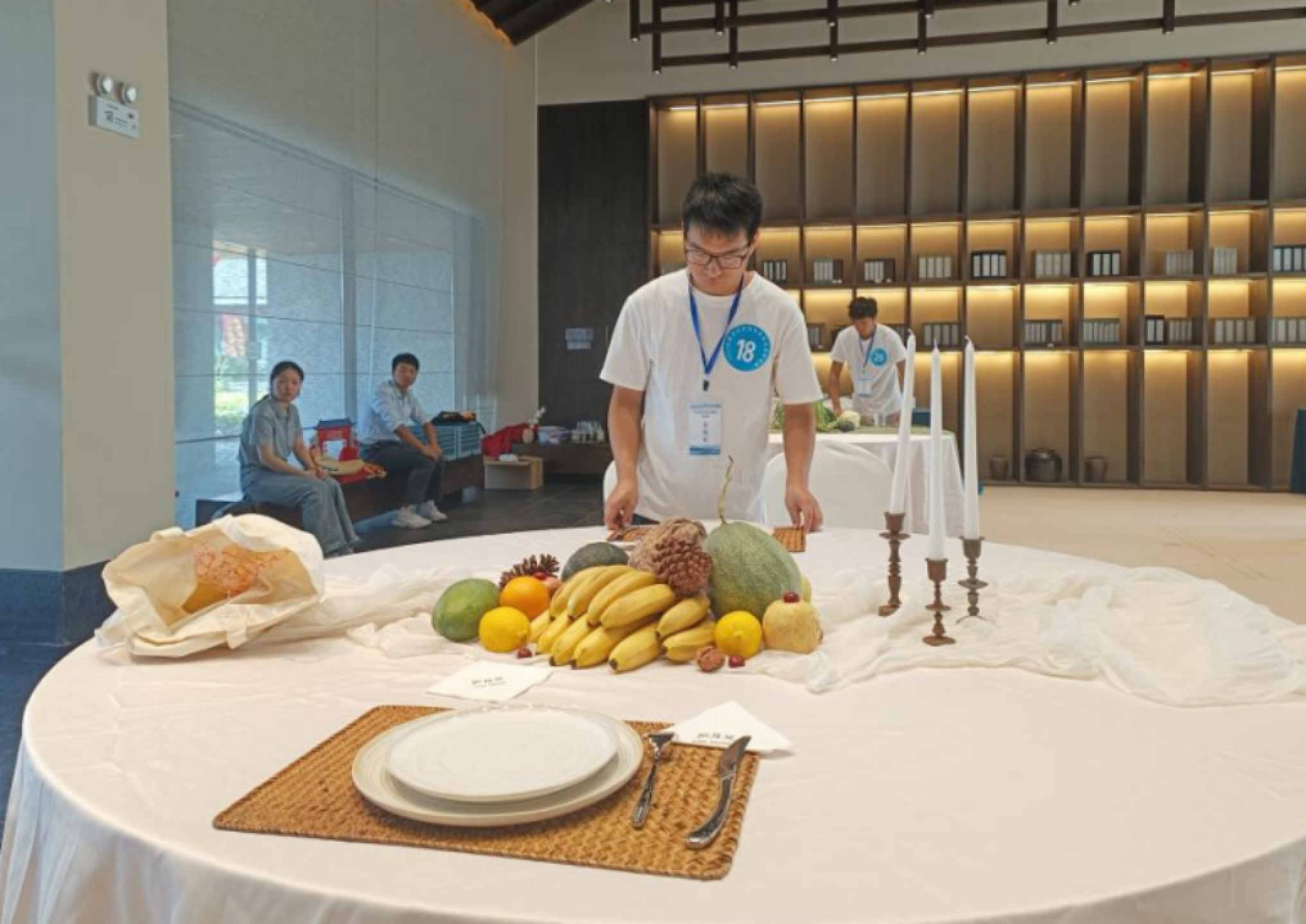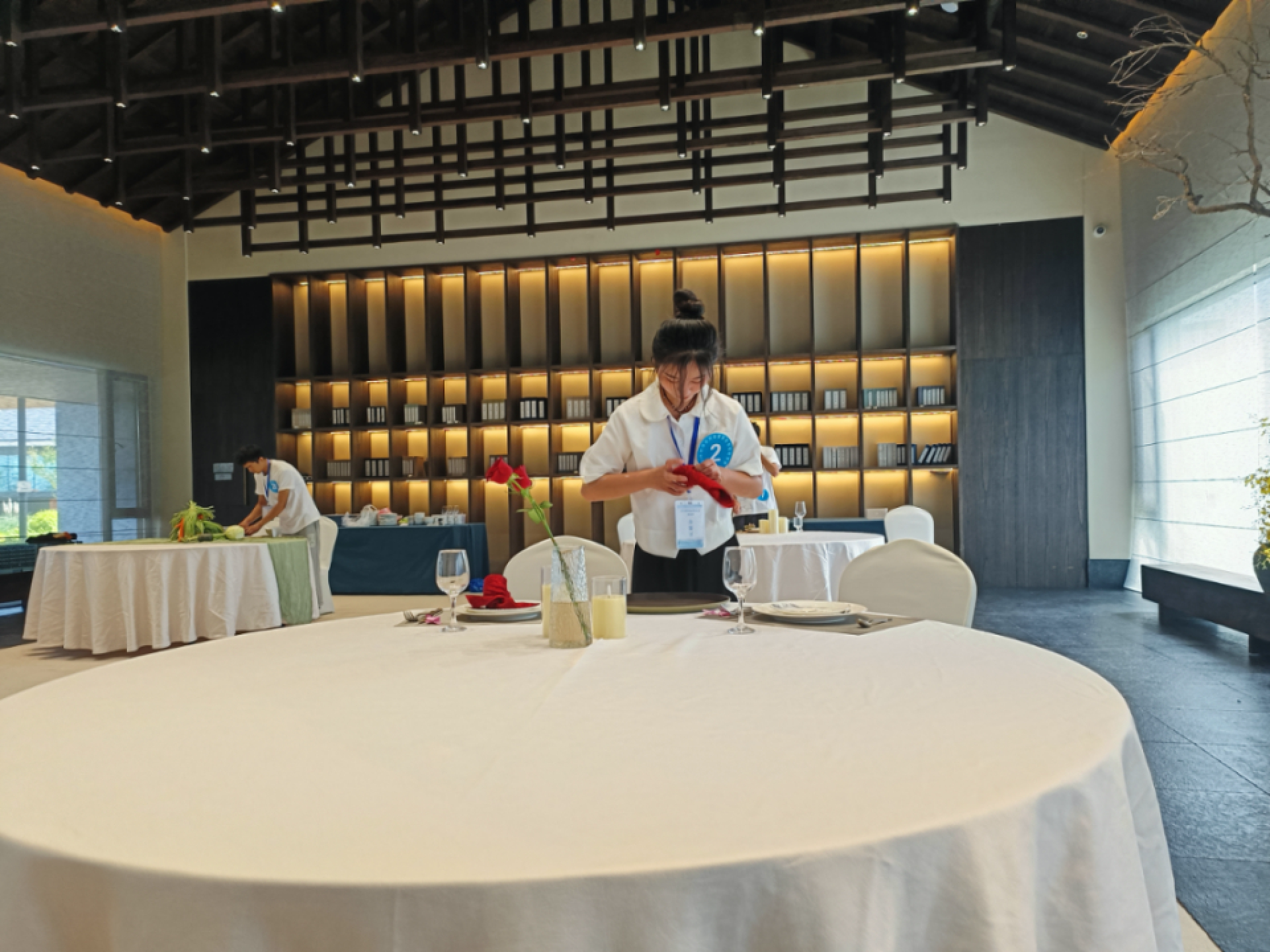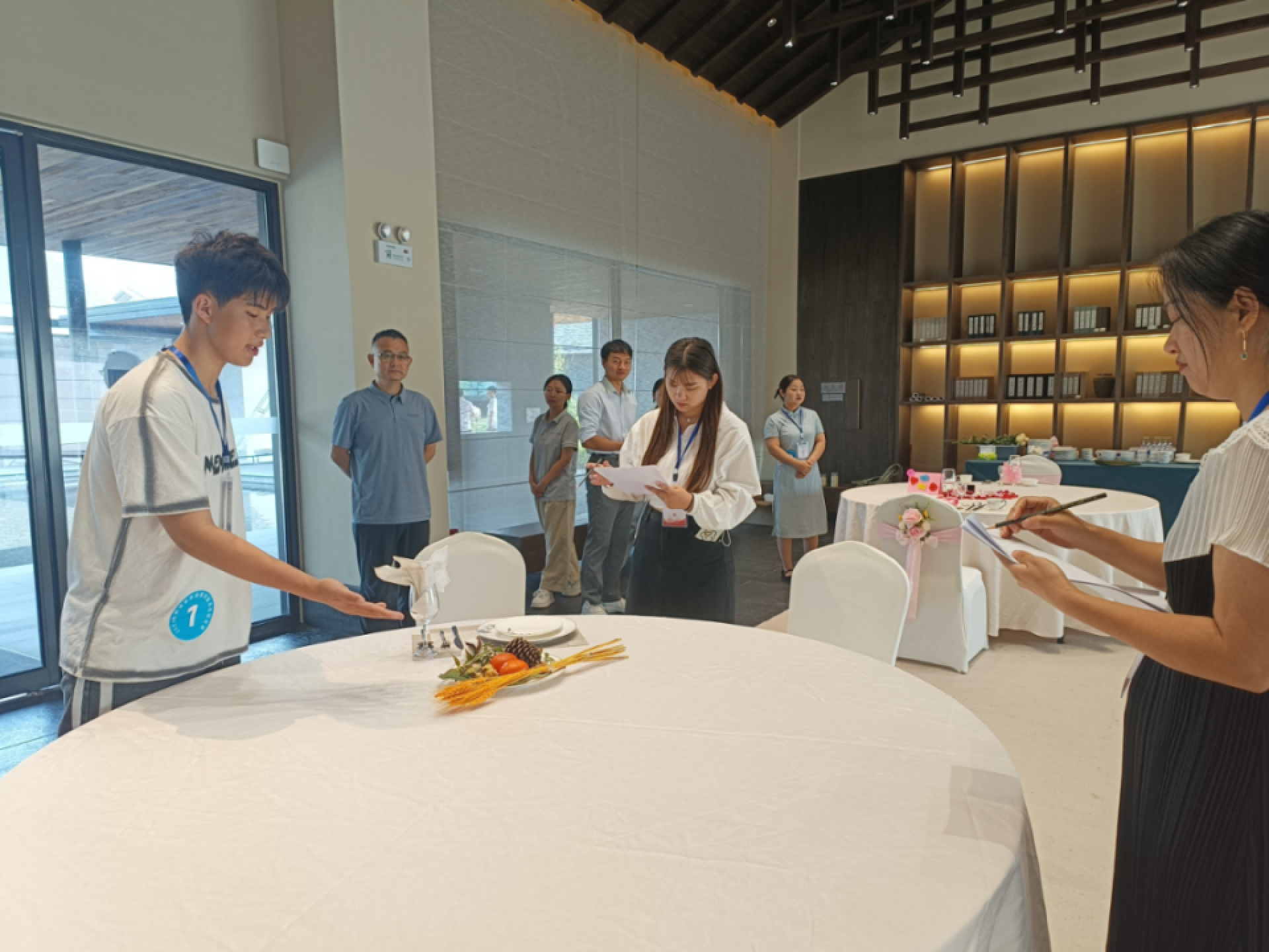 本次竞赛分为模拟面客、民宿文化主题客房布置、餐桌氛围摆台、下午茶制作四个环节。比赛现场气氛热烈,各个环节的比赛,选手们身怀绝技、应对自如,展现出了高度的专业水准及优秀的精神面貌,获得了评委和观众的一致认可和点赞。最终,经过一天的激烈角逐,6名选手脱颖而出。