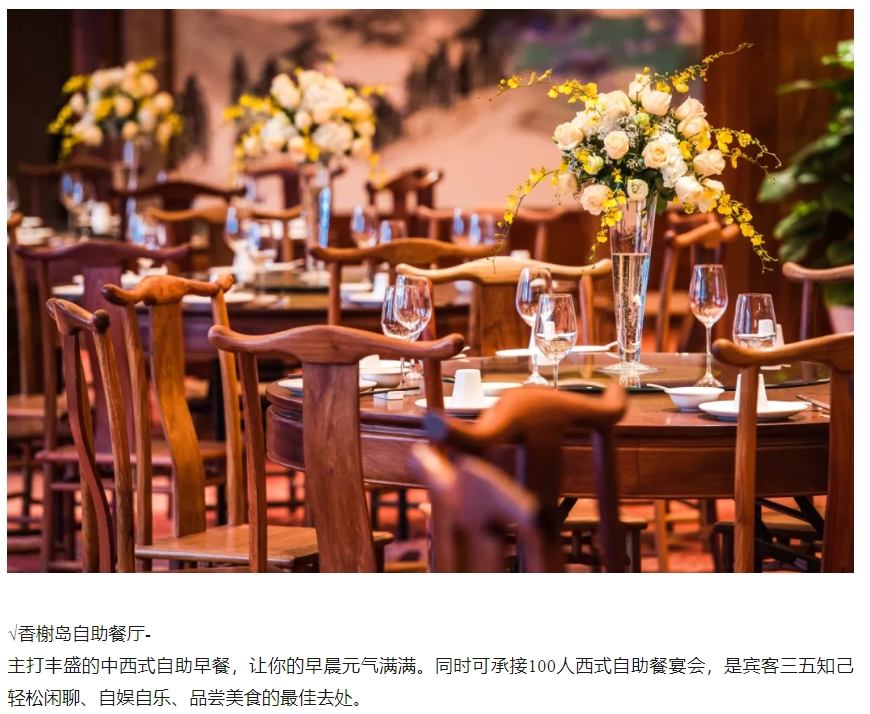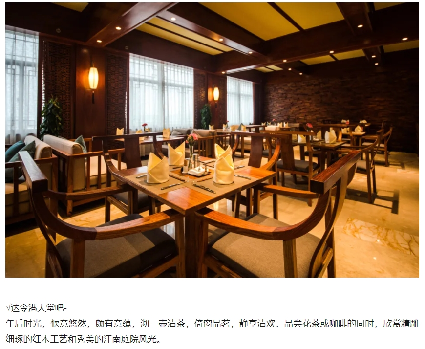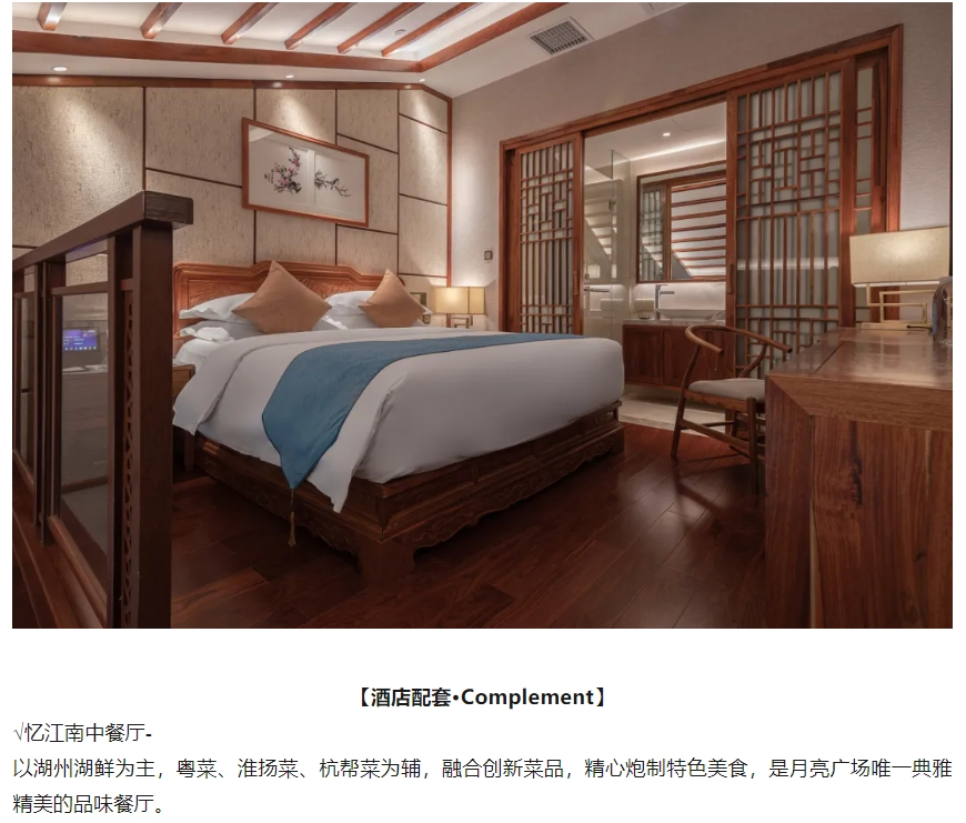 浙江湖州红木房雅阁璞邸酒店(雅阁酒店集团旗下成员酒店)设有忆江南中餐厅、香榭岛自助餐厅等,欢迎大家来品尝度假开启缤纷旅途。