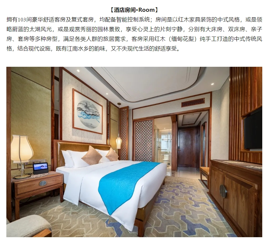 酒店拥有103间豪华舒适客房及复式套房,均配备智能控制系统;房间是以红木家具装饰的中式风格,或是领略蔚蓝的太湖风光,或是观赏秀丽的园林景致,享受心灵上的片刻宁静,分别有大床房、双床房、亲子房、套房等多种房型,满足各类人群的旅居需求,客房采用红木(缅甸花梨)纯手工打造的中式传统风格,结合现代设施,既有江南水乡的韵味,又不失现代生活的舒适享受。