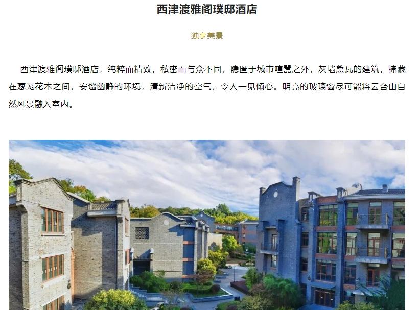 江苏镇江西津渡雅阁璞邸酒店(雅阁酒店集团旗下成员酒店)纯粹而精致,私密而与众不同,隐匿于城市喧嚣之外,灰墙黛瓦的建筑,掩藏在葱茏花木之间,安谧幽静的环境,清新洁净的空气,令人一见倾心。明亮的玻璃窗尽可能将云台山自然风景融入室内。