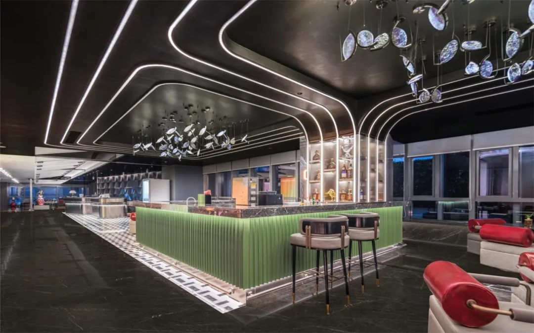 OUIBAR+KTCHN巧妙地融入了山林云海等自然元素,让人仿佛置身于大自然的怀抱中。空间内巧妙运用了光影手法,将鸟飞翔的意象展现得淋漓尽致。天花板上悬挂的圆形灯具如同鸟巢中的明珠,散发出柔和而温馨的光芒,为整个空间增添了一份生机与活力。当阳光透过窗户洒落在地面上,形成斑驳的光影效果,让人仿佛看到了鸟儿在云层中自由翱翔的壮观景象。