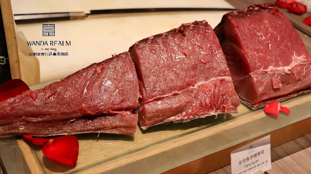 现开蓝鳍金枪鱼,感受极致新鲜: 伴随着大师娴熟的刀工,整条蓝鳍金枪鱼被分割成各个部位,鱼腩、鱼背、鱼腹等部位色泽鲜亮,纹理分明,仿佛还带着海洋的气息,让宾客第一时间感受到金枪鱼的极致新鲜。