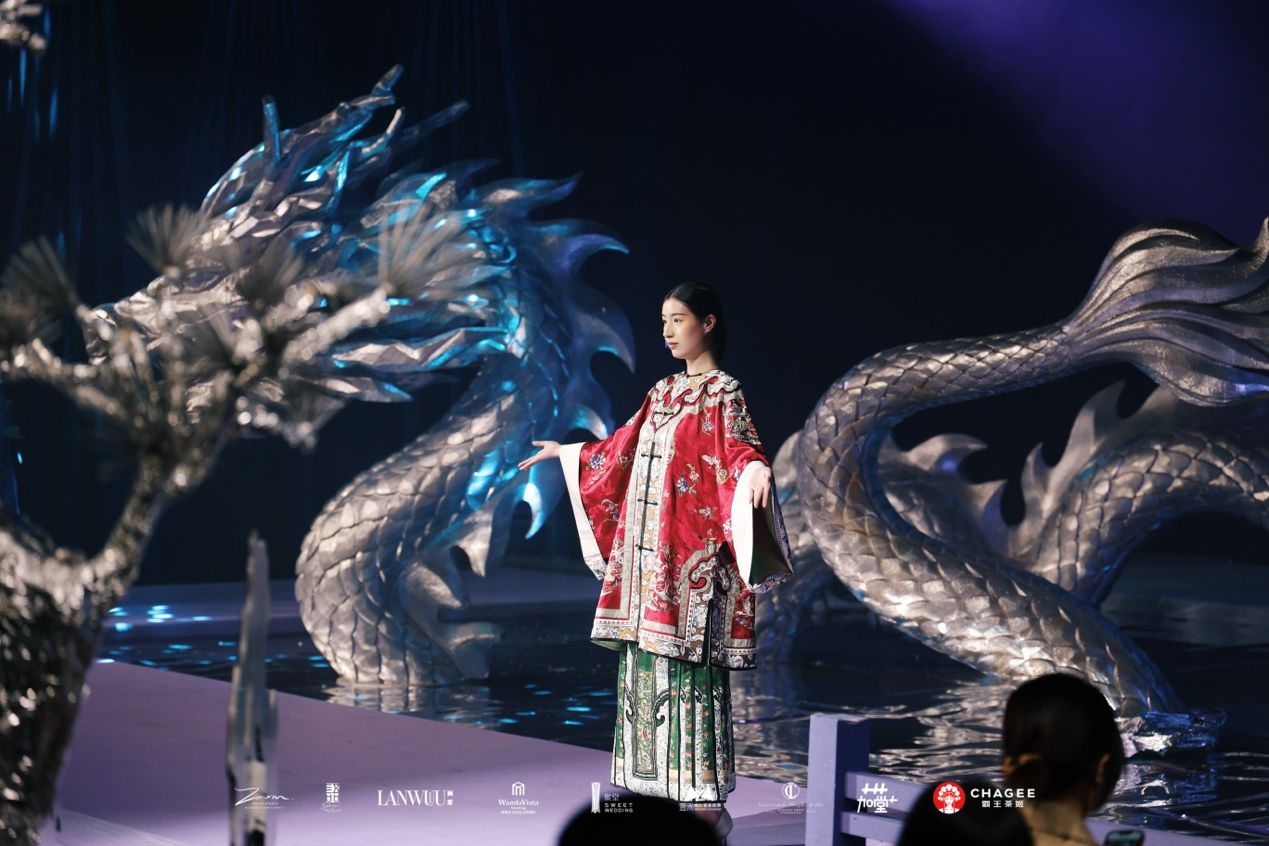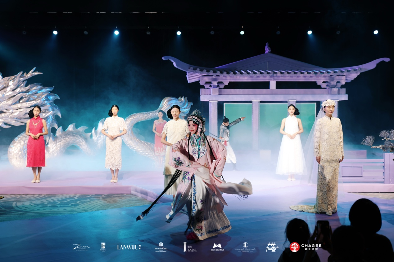 华服大秀:展示了数十套融合刺绣工艺的改良中式礼服,在T台光影中诠释"新国潮"设计哲学。