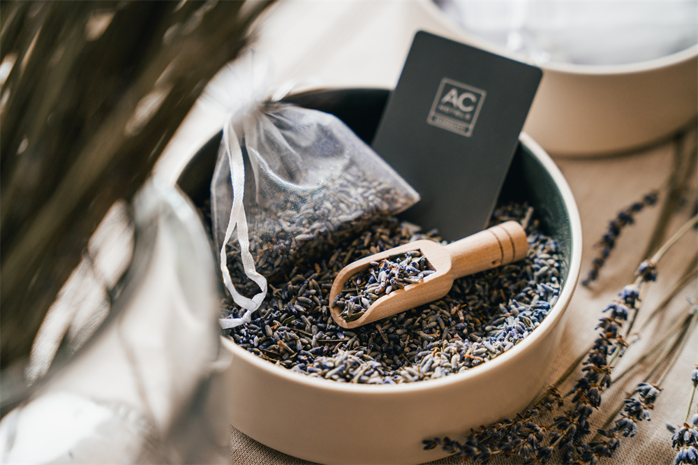 从上到下:AC欧轩酒店将采用的KORRES洗护备品、以薰衣草制作的助眠香囊