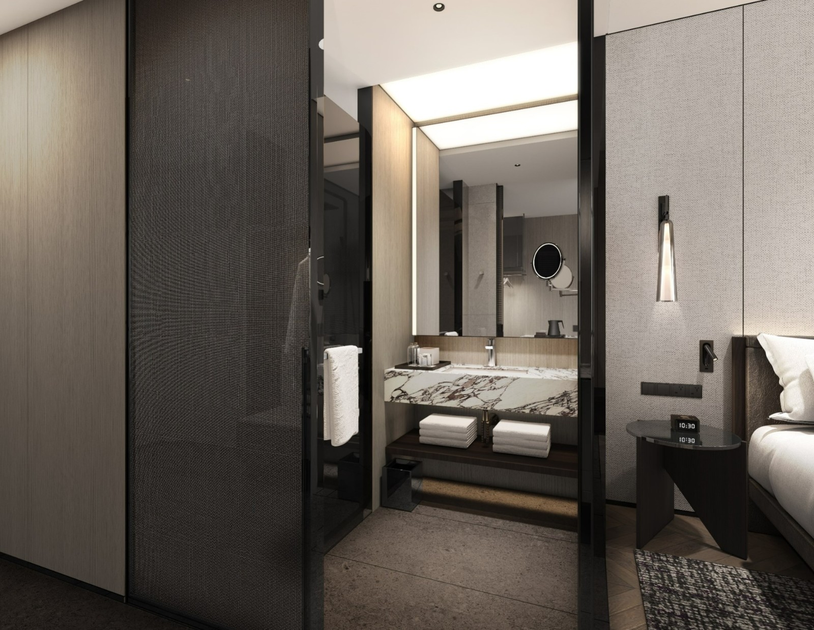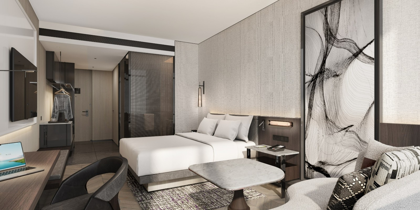客房配备干湿分离的卫浴空间,封闭的淋浴区和独立洗手间兼顾旅行时每一位宾客的隐私和便捷,还能适应不同柱距的物业条件。客房配备的智能设施恰到好处:智能马桶、自动窗帘、灯光控制等充分满足中国消费者对智能化与简约便捷的双重需求,助力宾客尽享自得之乐。