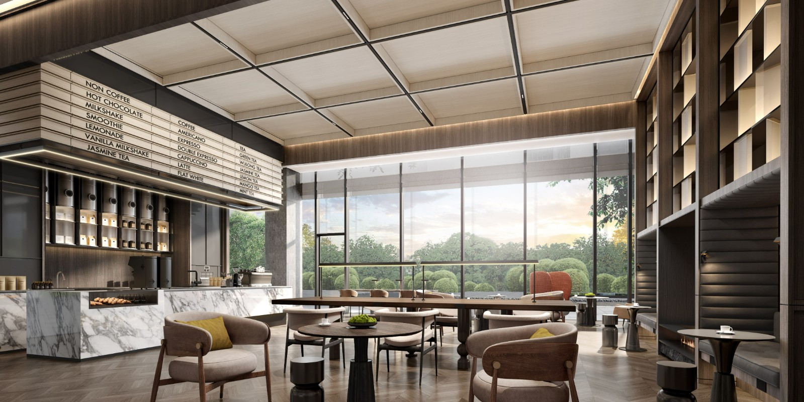 酒店大堂以模块化的多功能区域设计,打造开放灵活的公区空间。在洽然有序的公区氛围中,宾客可在高效工作、休闲社交与惬意私享之间轻松切换。大堂内的AC咖啡吧融入现代都市生活节奏,在白天提供舒适的咖啡体验,到了晚上则转变为热闹的酒吧,打造全天候不同时段的放松休闲场景。AC沙龙会议室提供安静私密的空间,满足独处休憩、工作洽谈的私享需求。配备电源和舒适座椅的办公区域满足移动办公需求。