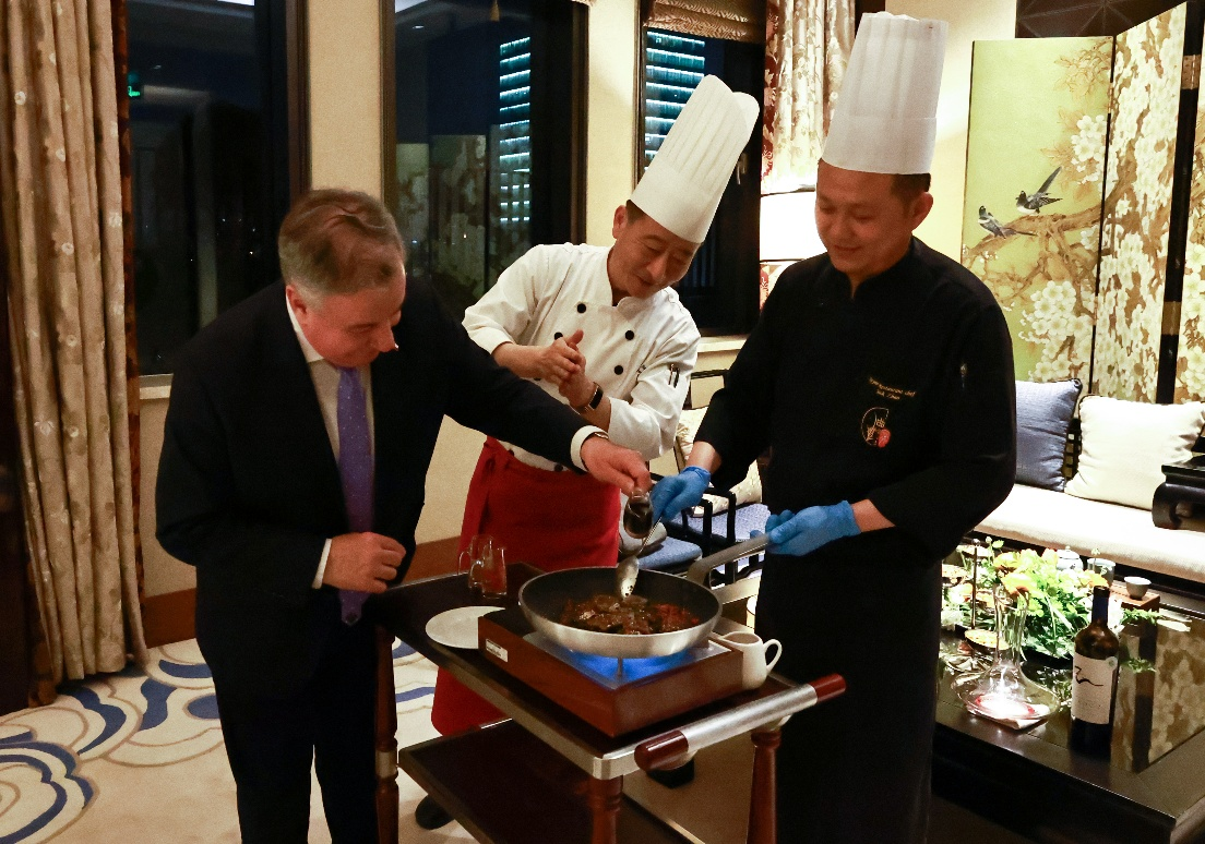 会后,智利大使馆和张裕先锋国际的客人与万达酒店方一起参加了“寻味鲁菜”主题菜品品鉴晚宴,晚宴上智利驻华代办大使、张裕进口酒事业部总经理,与万达酒店特聘主厨蒋应荣先生亲切互动,谈笑间还共同参与了一道“荠菜芝麻煎雪花牛肉”的烹饪过程,以山东雪花牛肉为主要食材,沁入张裕智利魔狮酒庄的红酒提鲜,色泽亮丽,香味满堂。