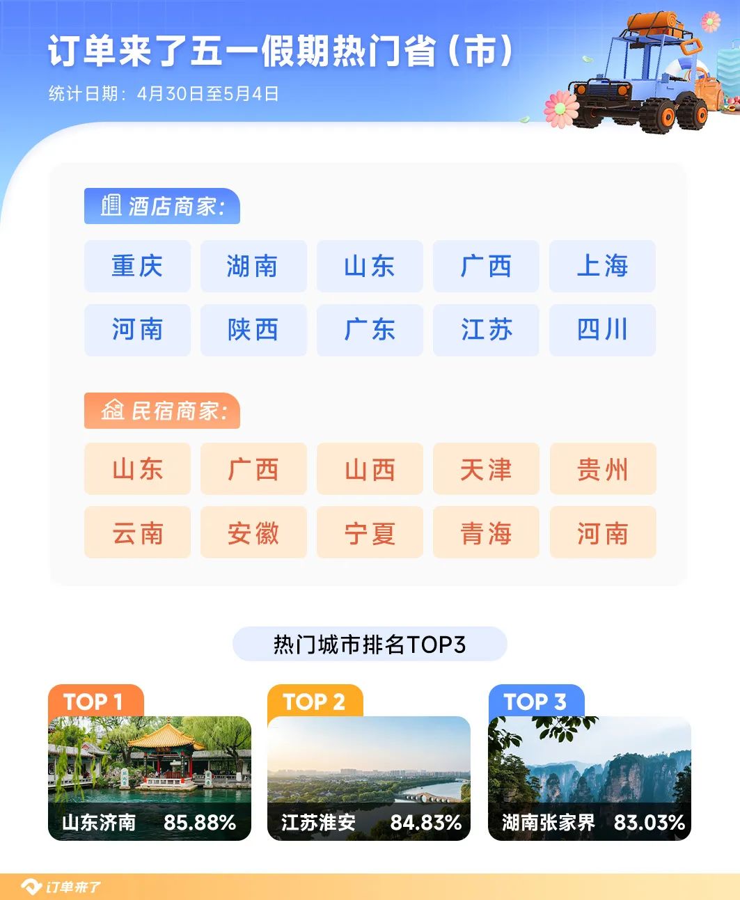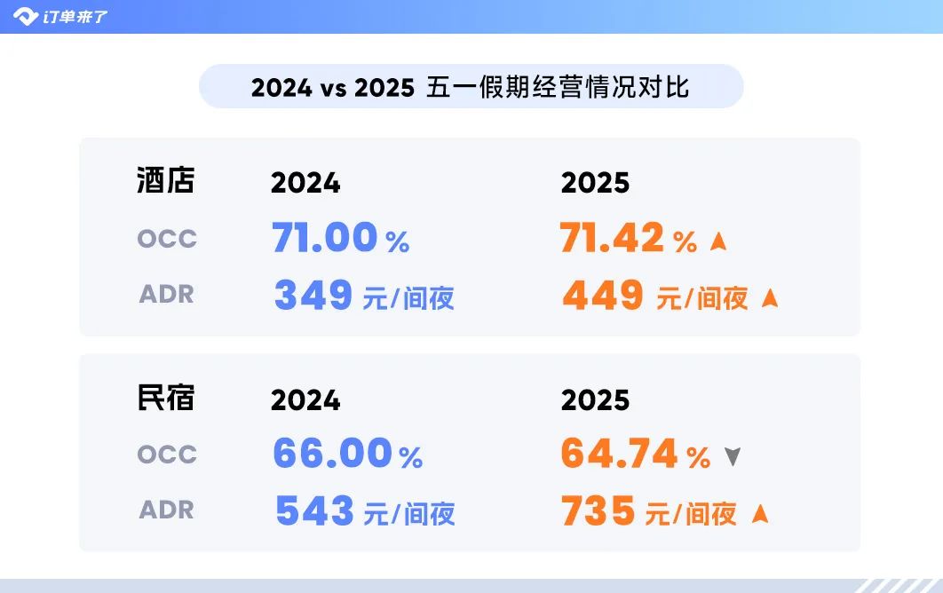 截至5月5日,酒店商家五一平均入住率71.42%,同比去年上涨0.6%,平均房价448.58元/间夜,同比去年上涨28.53%。