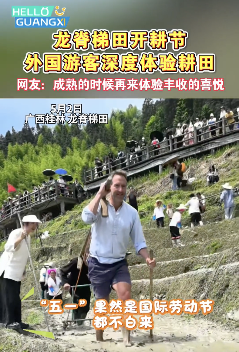 5月2日,一年一度广西桂林龙脊梯田开耕节拉开帷幕,活动现场特设“沉浸式农耕体验区”,众多外国友人下田耕作,感受农耕乐趣。