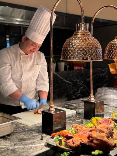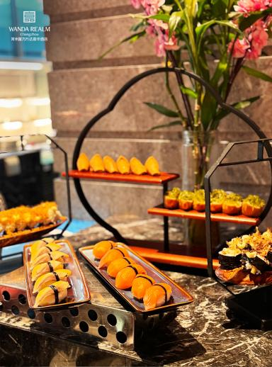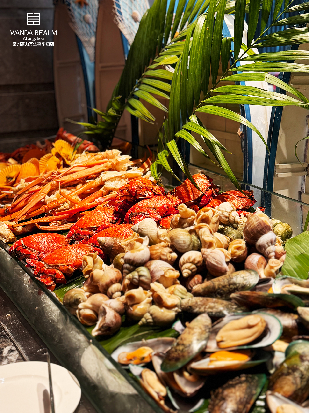 万达嘉华酒店亮点纷呈,畅享美食盛宴:1.海鲜狂欢:新鲜的波士顿龙虾派送、雪蟹腿、生蚝及刺身拼盘,满足海鲜爱好者的味蕾。2.国际档口:日式手握寿司、东南亚风味冷吃海鲜、德式香肠等,一站式吃遍全球。3.中式经典:精选淮扬菜及本地特色,如小米辽参汤、常州银丝面,诠释地道江南风味。