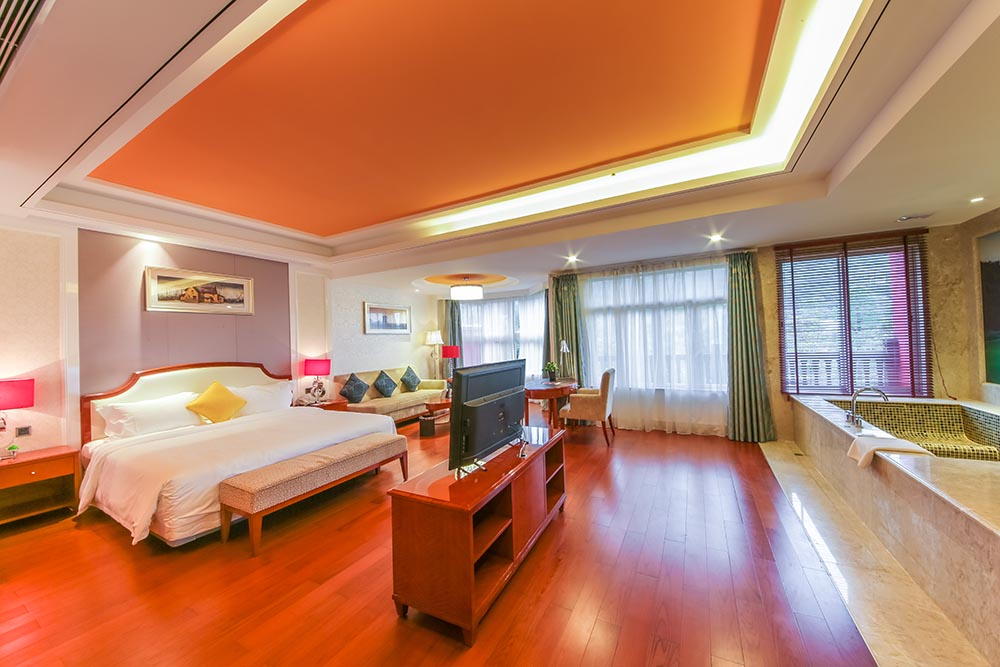酒店的餐厅简直就是美食爱好者的 “快乐星球”!早餐时段,既能嗦上一碗鲜香四溢的河源猪杂汤米粉,瞬间唤醒沉睡的味蕾,又能品尝欧式经典面包、培根,搭配香浓咖啡,中西合璧的搭配超满足;午餐和晚餐更是惊喜不断,大厨巧妙地将粤菜与欧式美食进行创意融合 —— 鲜嫩多汁的德国烤猪肘搭配客家酿豆腐,酥脆的香肠配上河源特色五指毛桃鸡汤,每一口都是味觉的奇妙碰撞!还有现烤的德国碱水面包、精酿啤酒,让你不出酒店就能体验地道的欧洲风味。不想出门?24 小时客房送餐服务随叫随到,躺在舒适的大床上享受美食盛宴,这才是度假的正确打开方式!