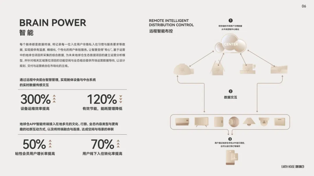 地球仓围绕“移动、智能、生态、人文”四大核心属性,通过自主研发、自主生产、自主运营,根据不同应用场景开发出地球仓+系列旅居空间装备产品,并拥有“地球仓”“未来舱”“未来仓”等品牌商标与六十多项技术专利。基于落位项目的实践交付与运营管理,地球仓科技探索出一系列以人、旅居、自然与场域等要素融合的“生态旅居”地球仓范本。