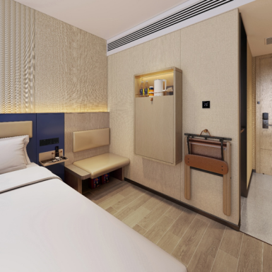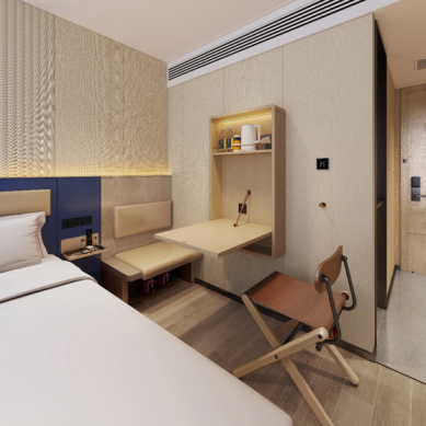 客房更是借助大规模壁挂和折叠式家居设计,实现了单房面积12-15㎡的空间优化再造,不仅大幅提高了出房率,还降低了客房套内投资成本,并且对墙面的利用也更加高效,充分释放了房间地面空间,有效破解小面积客房空间所带来的逼仄感、压抑感痛点,再搭配产品最低30间起的极致房量设计,投资者可以大幅拓展自己的物业选择空间,众多城市里条件有限的社区小微物业都符合新版本产品落地要求,投资选择将更灵活、总投资成本更低。