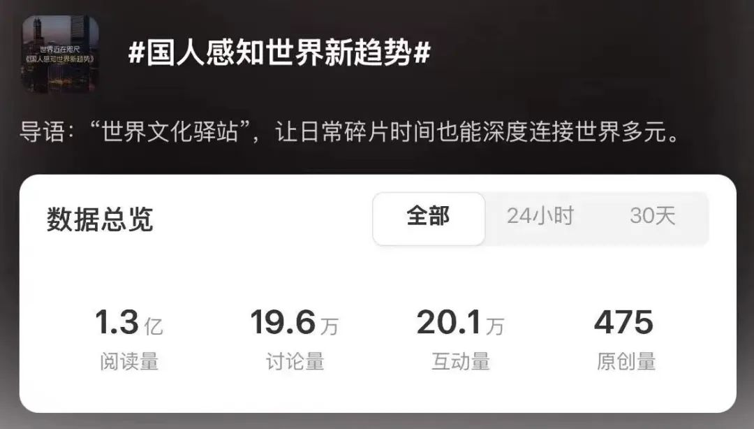 7月3日,一个由凤凰周刊、环球杂志等媒体发布的《国人感知世界新趋势》视频引发热议。相关话题#国人感知世界新趋势#曝光量过亿,互动讨论量近40万人次,揭示出当下国人“无需远行就可以Touch the World”的新型需求。