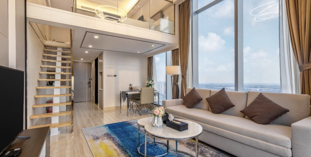 公寓由澳洲雅阁酒店集团管理,2020年开业,是阳江首家Loft服务式公寓。268间(套)客房4.9米奢华层高,一层客厅、二层卧室,动静分区互不打扰;全幕墙Low-E中空玻璃引景入室,智能新风+空气净化系统24小时鲜氧循环。