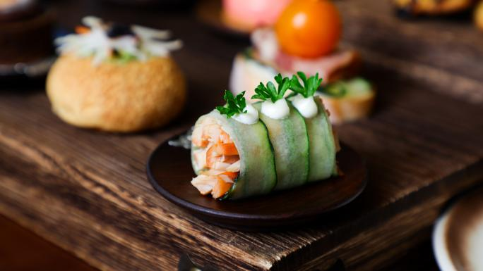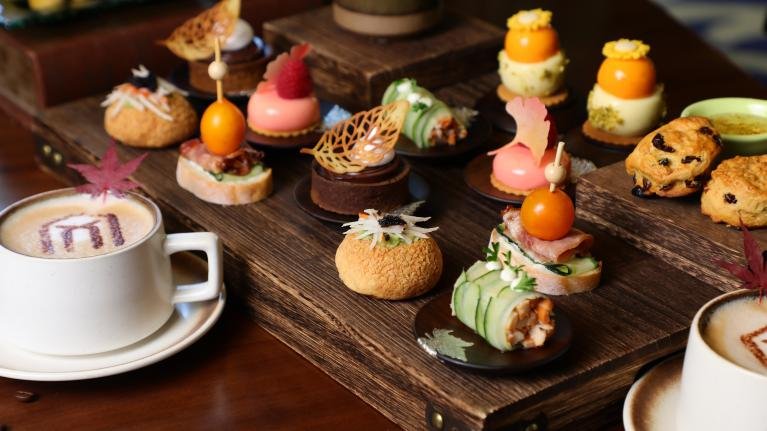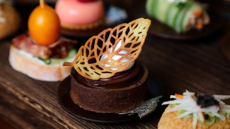 甜点包含秋季限定的栗子巧克力挞、微苦巧克力和酸甜西柚巧妙融合的西柚巧克力慕斯、丝滑芝士包裹着热带风情的蜂蜜百香果芝士,每一口都是秋日的甜蜜。咸点包含蟹柳牛油果塔、鸡肉节瓜三明治卷及培根青瓜法棍。除此之外,饼房团队另外呈现秋日现烤桂花司康及迷你水果盘。