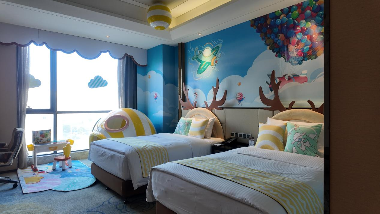 糖果飞屋鱼嘴双床房:以缤纷糖果色系与奇幻飞屋为主题,营造甜美梦幻的居住氛围。房内配备趣味主题家具、温馨双床布局及儿童专属用品,适合二孩家庭或亲友共同入住。
