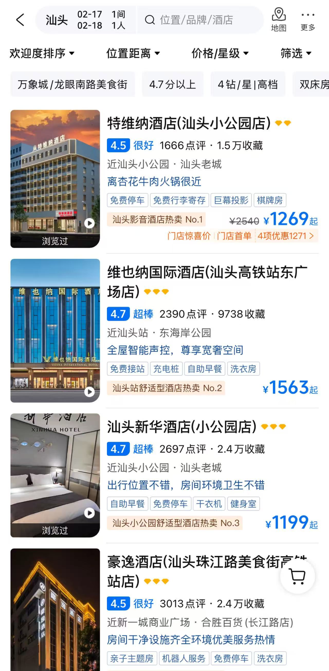 平日378元的大床房,春节直接飙到1074元,翻了近三倍;潮汕片区更夸张,汕头酒店预订量暴涨186%,揭阳162%,房价跟着水涨船高。