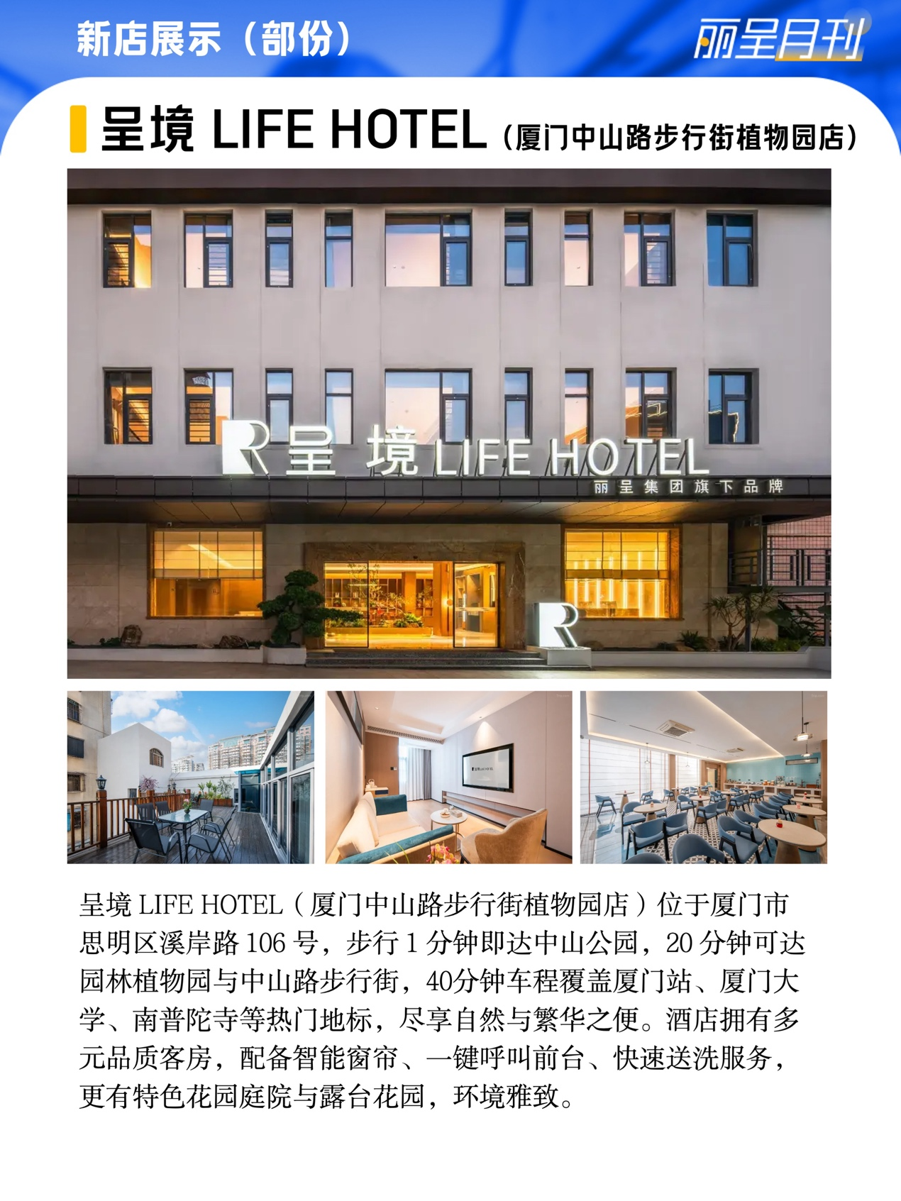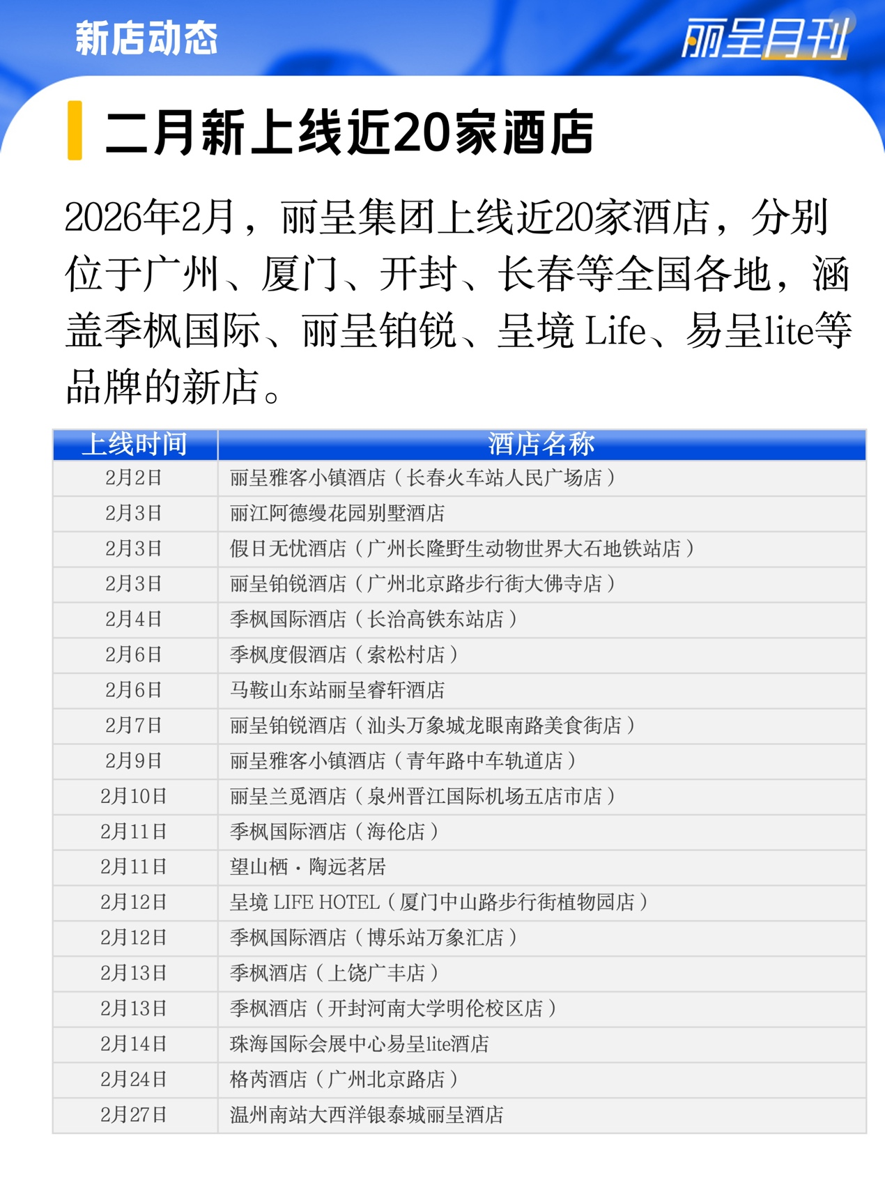 2026年2月,丽呈集团上线近20家酒店,分别位于广州、厦门、开封、长春等全国各地,涵盖季枫国际、丽呈铂锐、呈境 Life、易呈lite等品牌的新店。