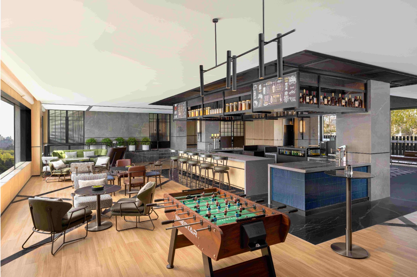 酒店打造丰富多元的餐饮体验。位于二层的“玩啤食社”(The MESH)集全日餐厅、特色酒吧等功能于一体,打造一站式社交共享空间,提供中西融合的丰富早餐及现片北京烤鸭、老北京炸酱面等京城地道美食,同时供应品牌标志性“醇饮优选”(Best Brews) 计划甄选的当地精酿啤酒,推出“京韵小麦”、“胡同IPA”、“秋酿桂花艾尔”、“冬日暖橙拉格”四款季节性特色精酿,让宾客在舌尖感受京城风味。此外,独立大堂吧供应香茗佳饮与醇香咖啡,是商务洽谈或休闲小憩的理想之选。