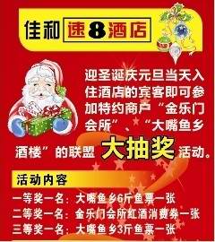 酒店联合特约商户金乐门会所,大嘴鱼乡酒楼联袂为广大新老客人在节日期间献上一道盛宴.活动期间凡入住上海佳和速8酒店的客人就有机会获得由大嘴鱼乡提供的6斤鱼票一张,由金门会所提供的红酒消费券一张,以及大嘴鱼乡的3斤消费券一张.让客人来到速8酒店,吃喝住都能享受到满意的服务.怎么样?节日期间招呼上几位好友快来上海佳和速8酒店体验一下吧.住速8吃美味鱼宴品优质红酒,这样的圣诞夜是不是既幸福又浪漫呢?