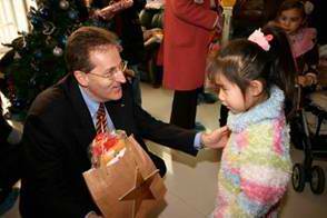 北京万达索菲特大饭店总经理彦•亚力山大为小朋友发礼物 【迈点网】2009年12月23日,30名索菲特形象大使代表酒店前往“济慈之...
