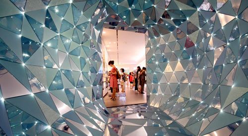 【迈点网】8月12日,施华洛世奇中国首间水晶轩旗舰店在上海和平饭店隆重开幕,店中一条特别铺设的“水晶隧道”令众多顾客赞叹不已。(中国新闻网)