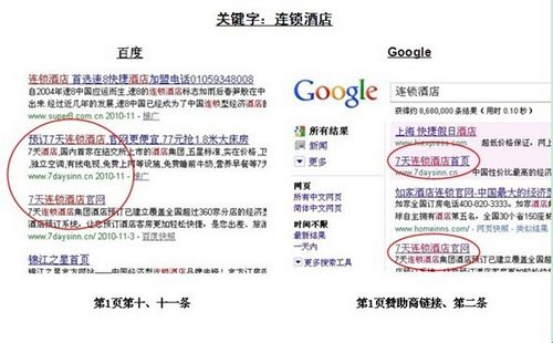 笔者通过在网络搜索引擎搜索:酒店、连锁酒店、经济型酒店等关键词,排在首要前面几个位置的往往是7天,如下图: