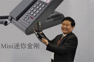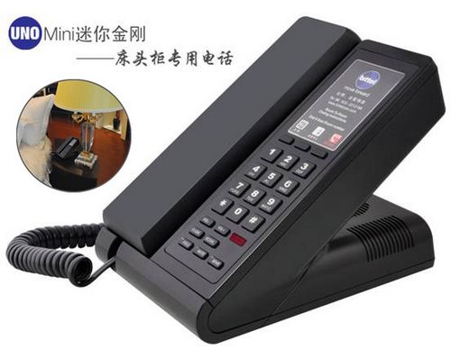 在本届展会上,继去年成功推出UNO变形金刚系列产品后,bittel 此次又推出了变形金刚产品家族的最新成员——UNOMini迷你金刚。这是一款小巧别致的精品型客房电话,专为床头柜而设计。除秉承了UNO变形金刚系列产品一贯的平面直线型设计外,UNOMini迷你金刚最显著的特点是体积小巧,长宽高分别仅为17.5*11.2*14.3(cm),非常适合放在狭小的床头柜使用,而且话机面板与底座的倾斜角度为35度,更加方便客人坐在床边接打电话,对住店客人非常人性化。
