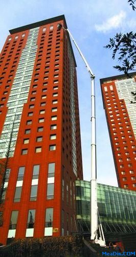 消防员乘坐90米曲臂登高平台消防车参加灭火救援