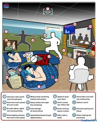 到2035年将以一系列软电子产品以及微型话筒装入枕头,来检测脑,REM和睡眠活动,使得独自在外的旅行者能够和家人聊天。