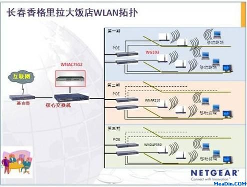 AP 方面,本次采用了 WG103 这款高性价比的54M产品。而在 802.11N 日趋成为主流的今天,WNAC7512+WG103 可能在日后需要升级到 300M 产品。所以 NETGEAR 推荐的 WNAC7512 也可以混合管理 11G 及11N的产品。若在项目的第二期、第三期工程中,酒店完全可以采用 NETGEAR 的其它型号胖瘦互转型AP,(包括 WNDAP350 / WNAP210 / WNAP320 等等)。因为所有 NETGEAR 的 AP 均基于 IETF 的 CAPWAP 标准所开发,能够与基于同样标准的 WNAC7512 智能无线控制器进行连接。