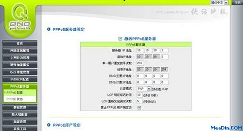 侠诺PPPoE服务器在管理方面也有着与众不同的表现,针对各个类型的PPPoE 用户,可以依其对应的IP地址设定不同的对外ISP(特定用户可享有大带宽服务,如酒店VIP高级用户等),可以设定防火墙规则控制用户的上网,也可以设定截止日期(管控各个用户服务的时效。另外,PPPoE服务器如果侦测到断线可以把客户端踢除,还可以设定LAN端PPPoE流量是否可以互通等。