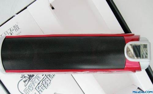 这个音箱是钢琴烤漆外形的,我拿到的是红色的,有点艳,听说有黑色的,男同胞拿着应该比较好。不过这个钢琴烤漆,放在自行车上很容易刮伤,不过还好随机附赠了一个音箱袋,应该能起到防护的作用。