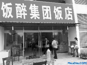这家“饭醉集团饭店”位于海德北岸小区门口,正对着迎江路,玻璃大门五六米宽,门头上方打着红底黄字大招牌,“饭醉集团饭店”。门外人行道上还竖着一米多高的店名牌子。店招如此醒目,许多行人经过时都要侧目。“嘿,这儿有家饭醉集团饭店。吃饭的饭,喝醉酒的醉。”“搞怪,哪有起这名字的?”两个骑摩托车的小伙子议论。