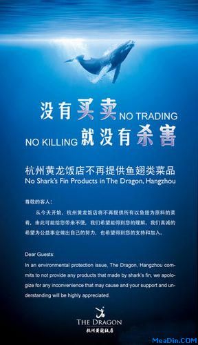 “杭州黄龙饭店郑重向广大消费者承诺,从今天开始(2011年9月19日),所有以鱼翅为原料的菜肴,将从我饭店的菜单上消失。今后,杭州黄龙饭店取消所有鱼翅菜品,不再以任何方式对外提供、制作、销售鱼翅菜品。原因很简单,援引那句公益宣言来解释没有买卖,就没有杀害。”这是杭州黄龙饭店《致全体消费者的一封公开信》中写道的。