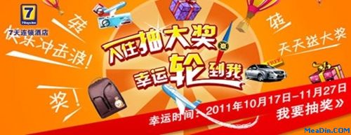 据7天连锁相关负责人介绍,7天快速稳健的发展有赖于广大会员的支持,此次会员入住抽奖活动旨在答谢广大新老会员、与会员共享7天的发展成果。第一期活动为期42天,从2011年10月17日到11月27日,凡是7天会员过夜入住任一家7天分店,就能得到一次抽奖机会。在7天官网该活动的宣传页面上可以看到,符合抽奖资格的会员只要转动“幸运大转盘”,就有机会得到往返机票礼包、免费租车法宝、高品质蚕丝被、健眼仪、双肩背包、iPhone防水袋、7天房费抵用券等礼品。