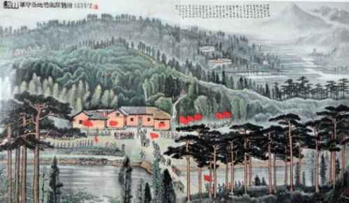 发端于20世纪50年代的"革命圣地山水画"是指在中国画的领域内表现"革命圣地"的山水画作品。此幅《韶山》创作于1974年,是李可染同类题材作品中尺幅最大的一幅(141.5×243.1cm),构图完整,经过多次加工,成为李可染的经典构图和革命圣地山水创作的集大成之作。
