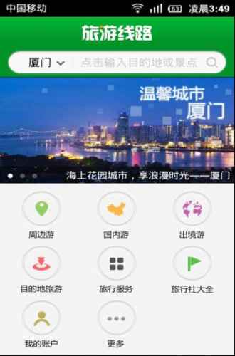 欣欣旅游网打造的手机客户端“欣欣旅游线路”主页面的功能部分底色以白色为主,体验简洁明快的特点,在页面顶端以欣欣旅游网常用的绿色色调为主,给人以自然清新的感觉;轮转图是城市旅游景点的风景图片,让游客登入页面就能感受到旅游的“气息”。