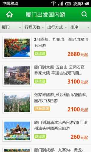 页面功能中除了可以调整出发城市外,还有行程天数、出行方式、排序等功能。游客可以根据自己的时间需求,在行程天数上可以选择3日以下、4日游、5日游、6日游等等。也可以根据旅游者自身的出游习惯在出行方式中选择:跟团游、纯玩跟团、独立跟团、自由行、自驾游等不同的出行方式,选择后系统将自动配给出相应的出行方式项目,以便游客选择。