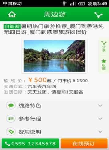 如果对该线路还有什么不了解或者有疑问的地方可以直接点击页面下方的电话,进行电话咨询,该细节体现出欣欣旅游线路客户端以最大限度地做到了流程的简化,使预定非常快捷便利。
